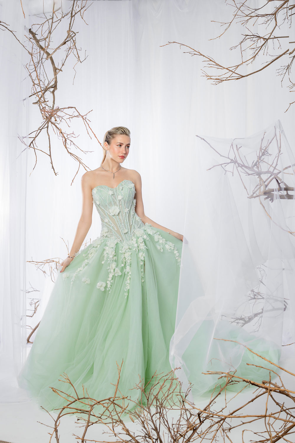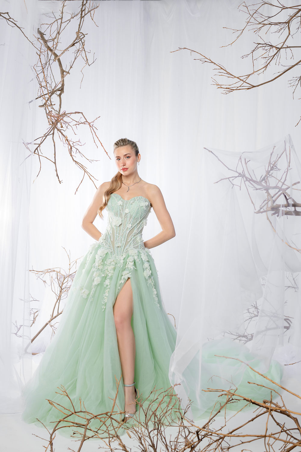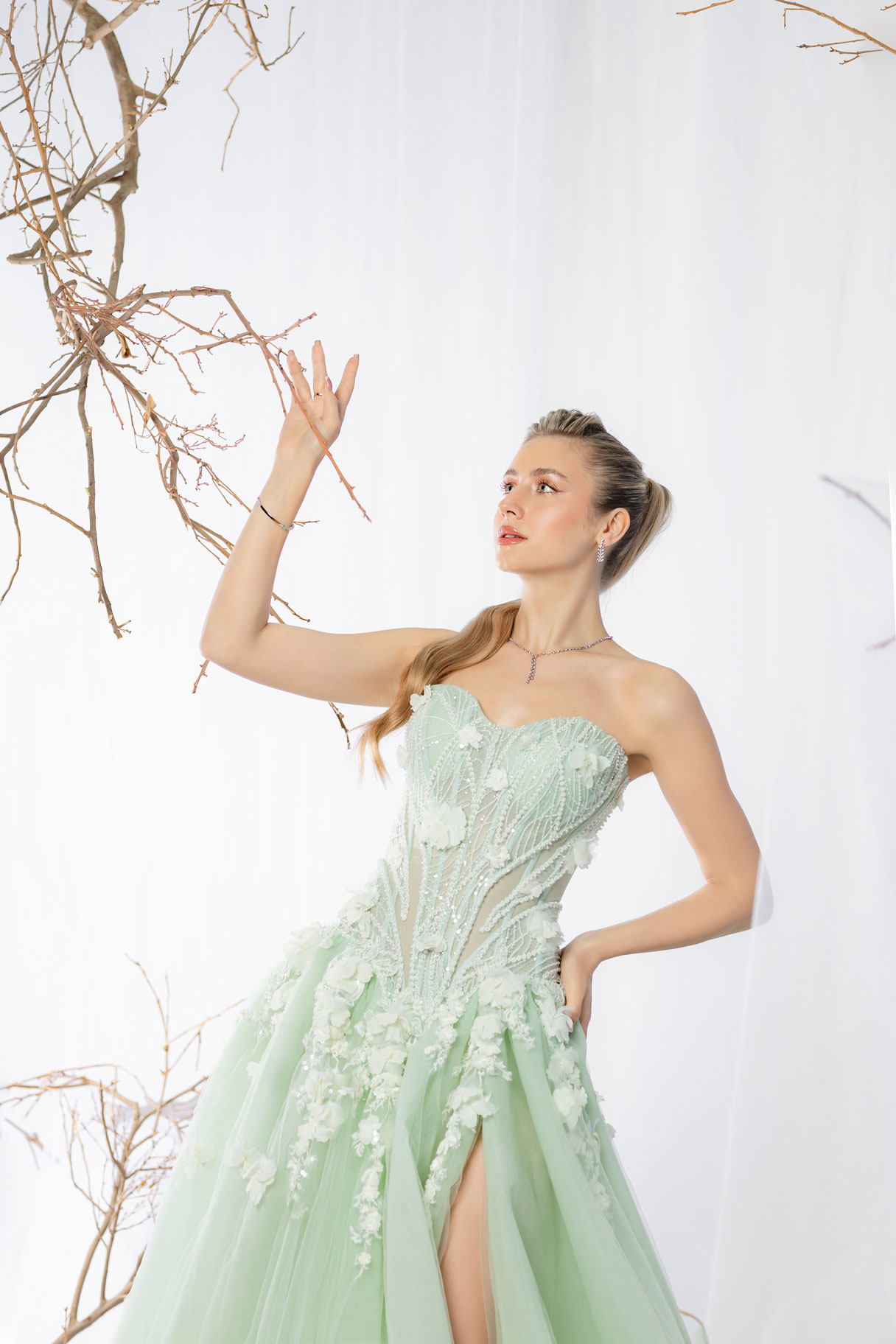 Mint-green tulle blossoms from a hand-sculpted corset embroidered in crystal foliage. A thigh-high slit unveils the bold, free spirit beneath its fairytale softness.
